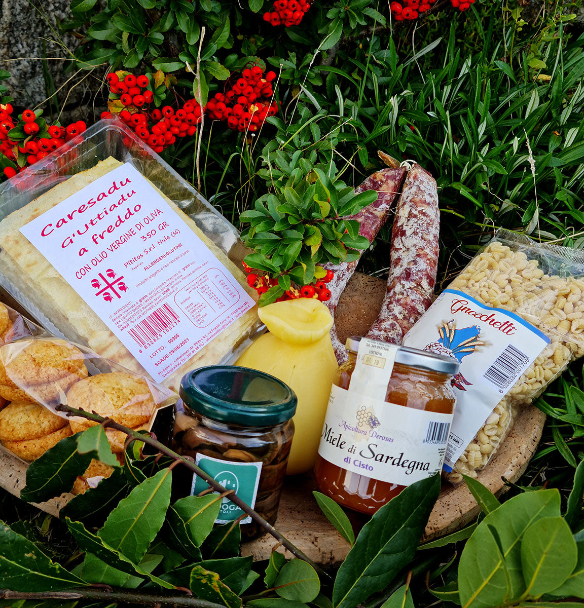 Il nostro catalogo comprende formaggi sardi DOP, salumi artigianali, dolci tradizionali, conserve, miele, pane carasau, vino Cannonau e olio extravergine d’oliva.